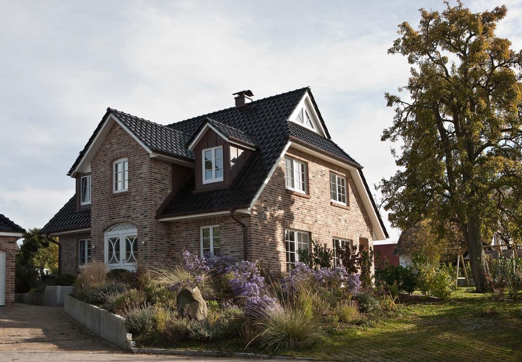 Tradition zeigt sich beim Haus Brodau von ihrer besonders einladenden und authentischen Seite. Das klassische Verblendmauerwerk, kombiniert mit dem tiefschwarzen Krüppelwalmdach samt Uhlenflucht und den breit ausgeformten Giebeln, verleiht dem Gebäude eine warme, charaktervolle Ausstrahlung. Ergänzt wird dieses harmonische Gesamtbild durch einen markanten Traufgiebel, insgesamt vier Gauben sowie helle Sprossenfenster, die dem Haus eine freundliche, nordische Leichtigkeit schenken. Eine aufwendig gestaltete Holz-Haustür setzt zudem einen besonderen Akzent und rundet das Erscheinungsbild ab, das die norddeutsche Wohnlichkeit im Landhausstil auf beeindruckend authentische Weise widerspiegelt.